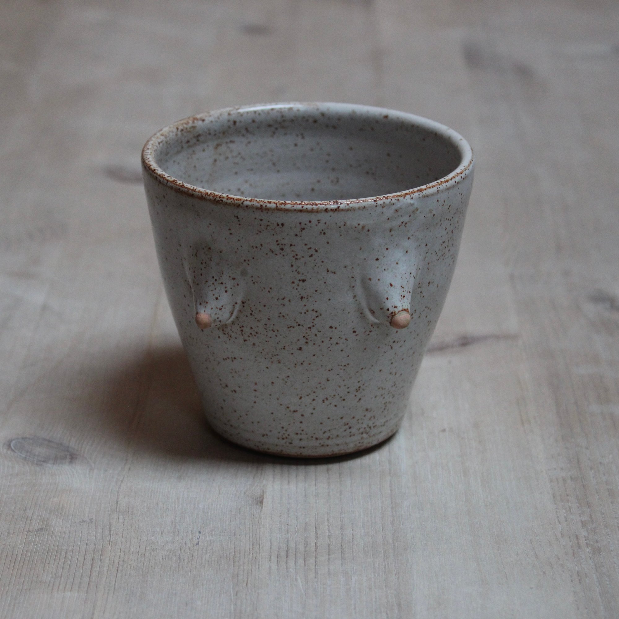 Wheel thrown in stoneware clay, glazed in a tin white glaze that lets the iron in the clay show through. Some bubbling under the clay but still functional.