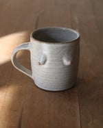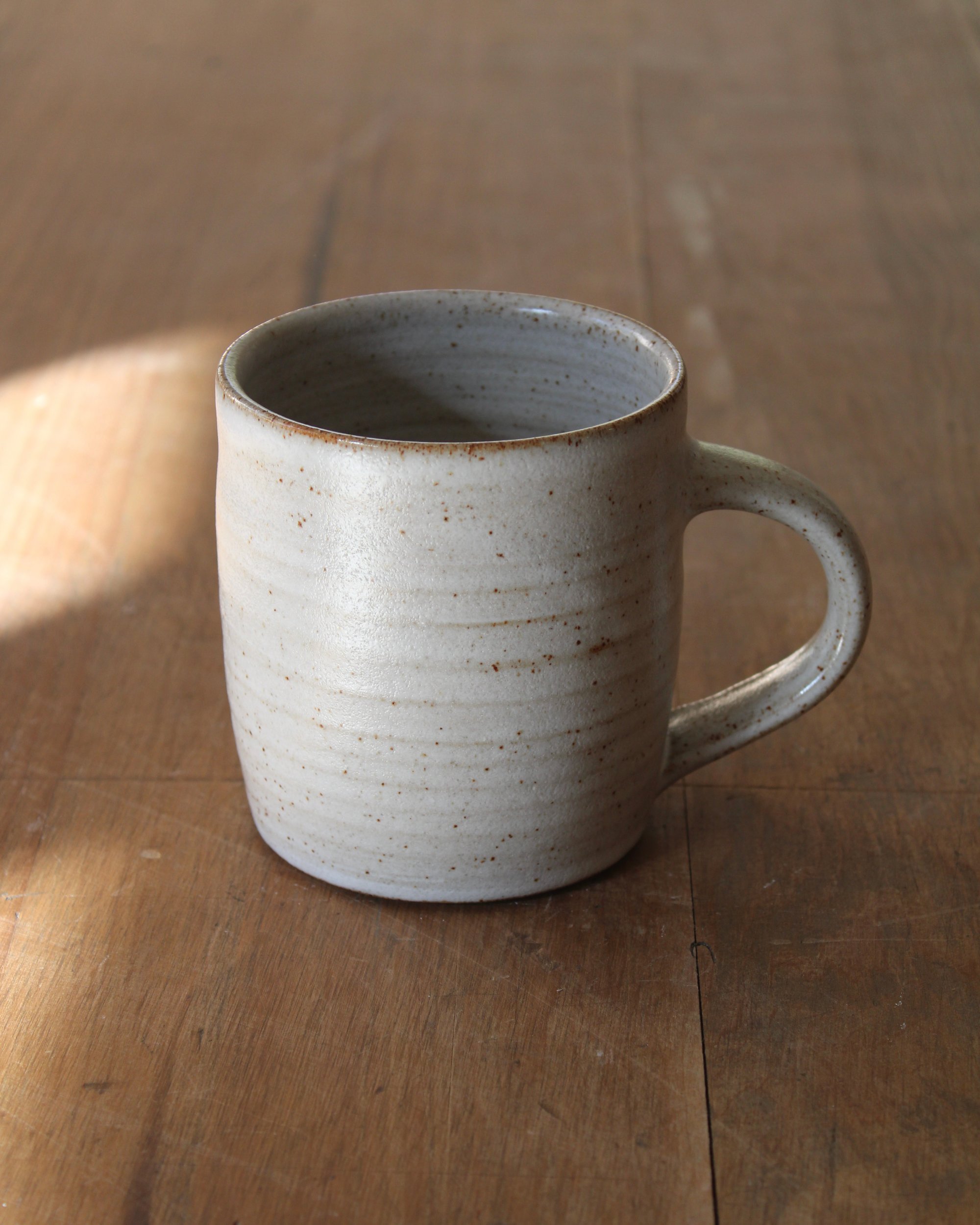 Wheel thrown in stoneware clay, glazed in a tin white glaze that lets the iron in the clay show through. Pulled handle.