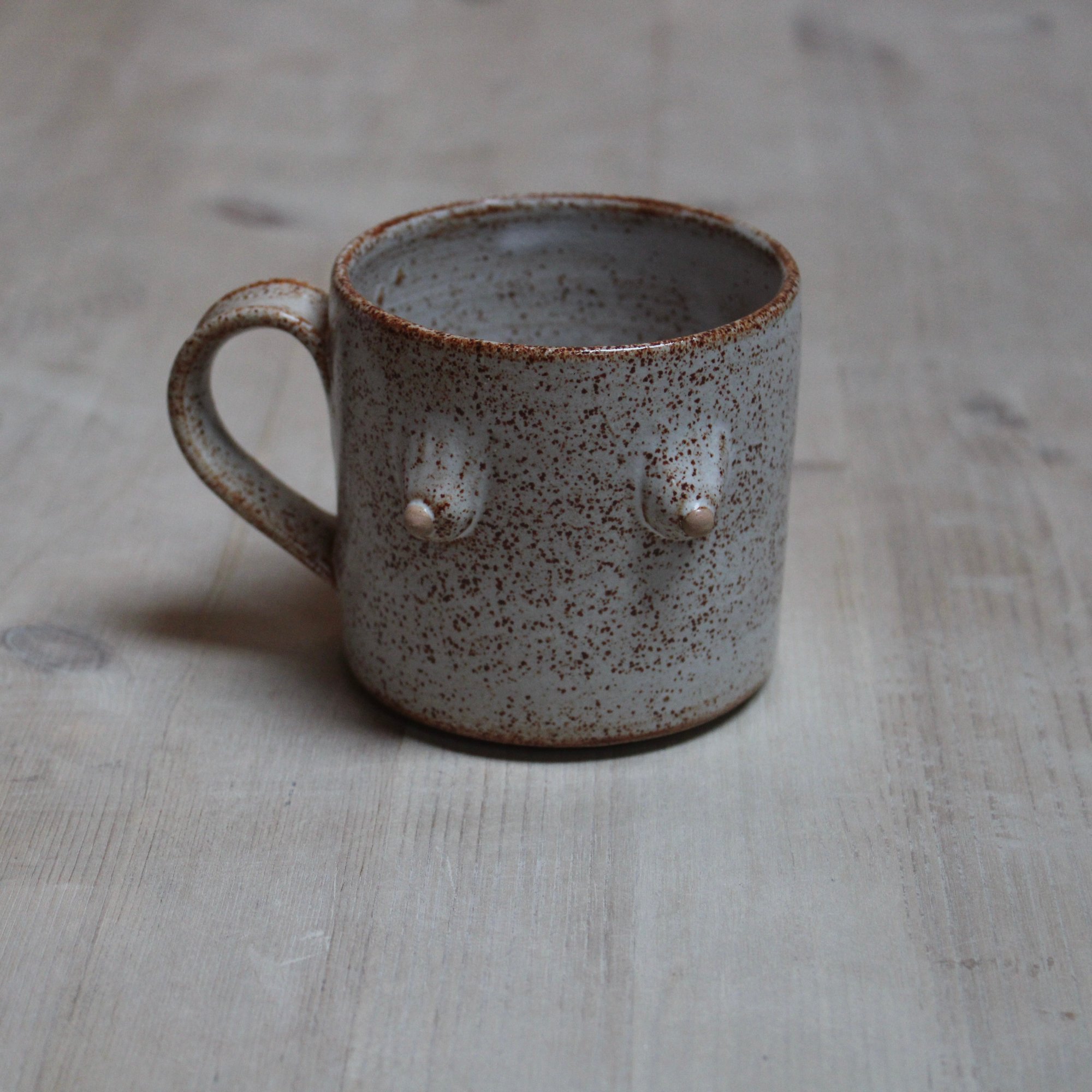 Wheel thrown in stoneware clay, glazed in a tin white glaze that lets the iron in the clay show through. Pulled handle. Smaller than the standard size. Some blistering, bubbly feeling in parts of the clay.