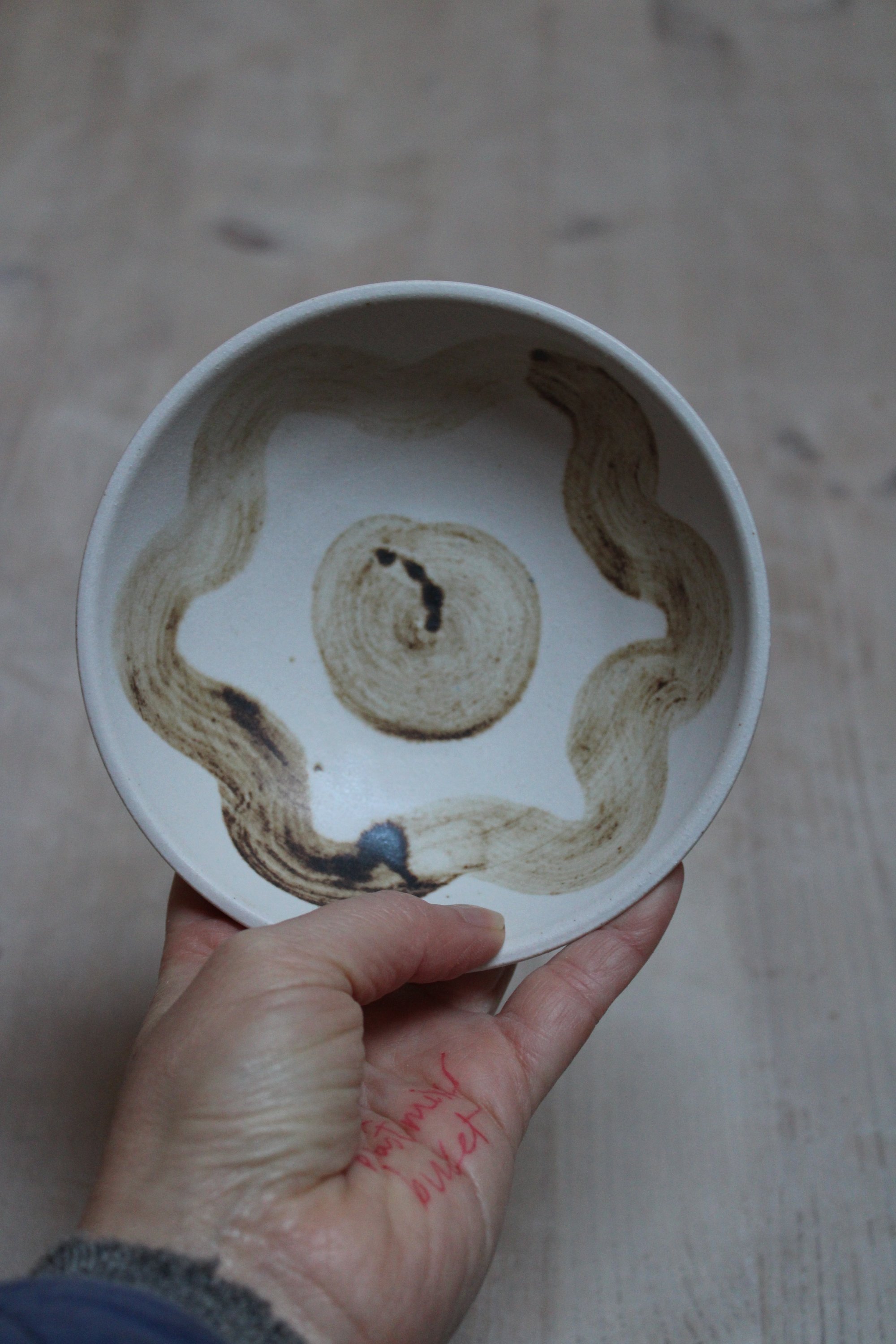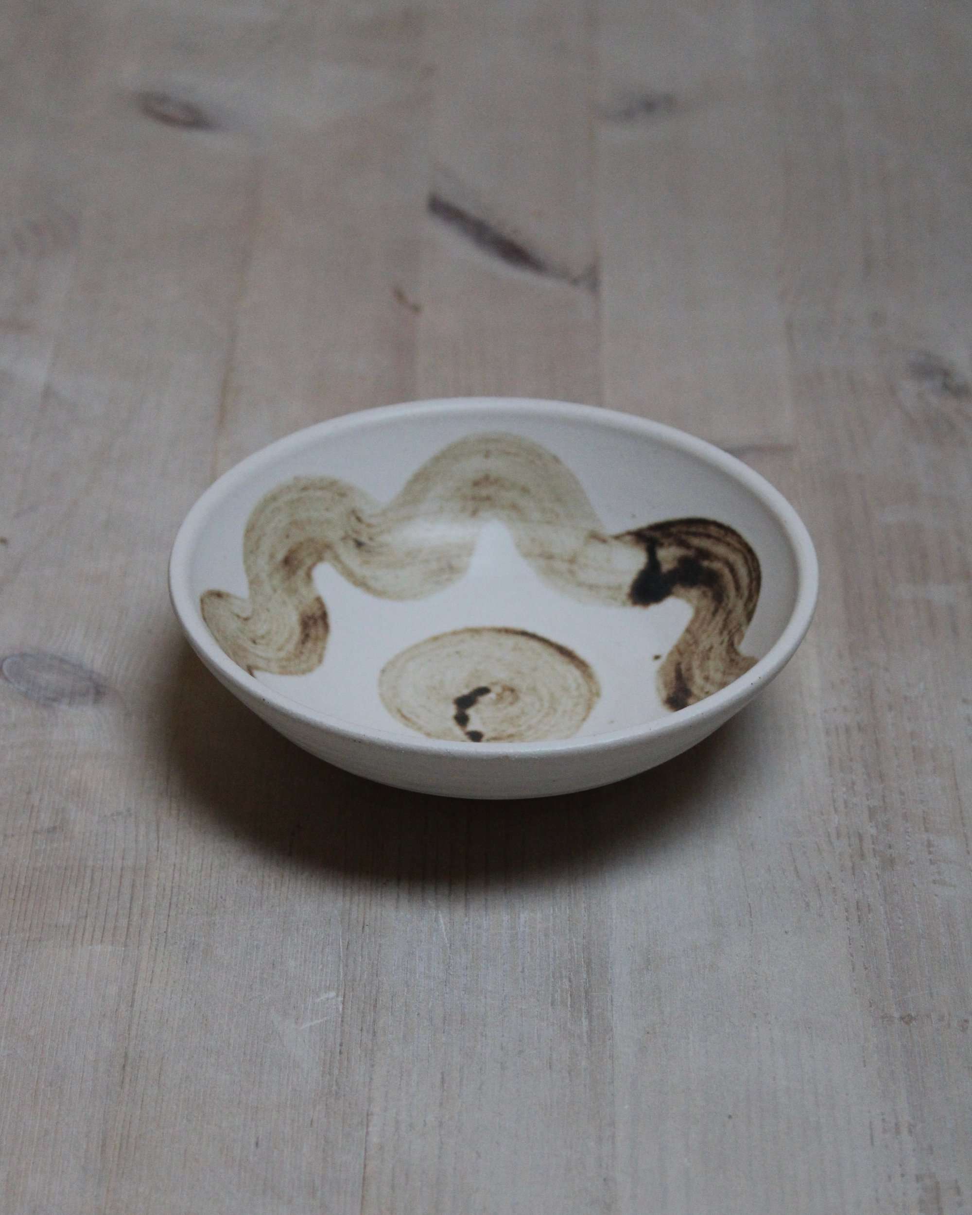 Wheel thrown in white stoneware clay, decorated in wild clay slip, with white glaze.