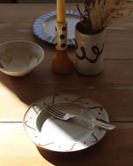 Wheel thrown in stoneware clay, glazed in tin white with iron wash decoration.