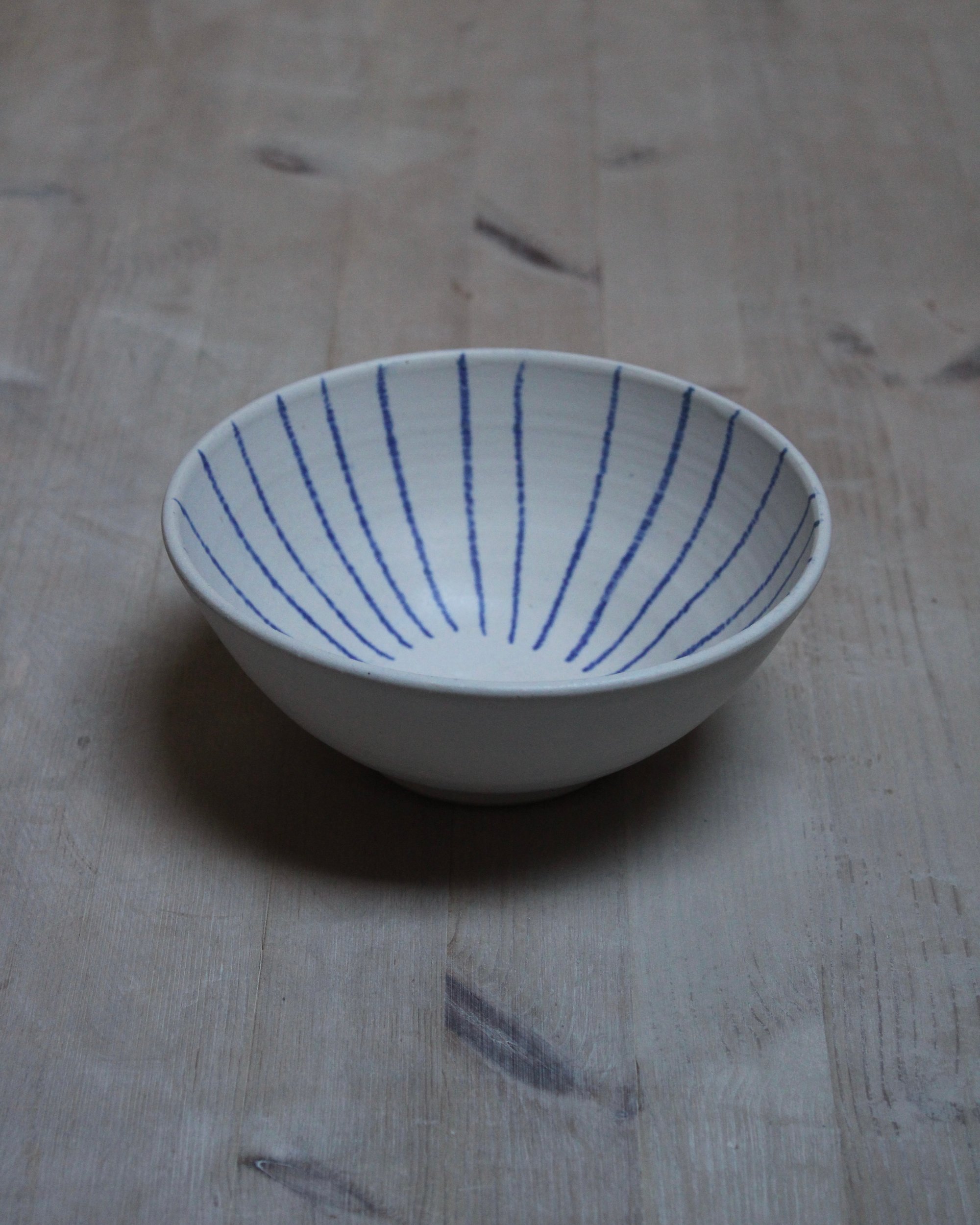 Wheel thrown in stoneware clay, glazed in a Lucy Rie white with pencil drawn decoration.